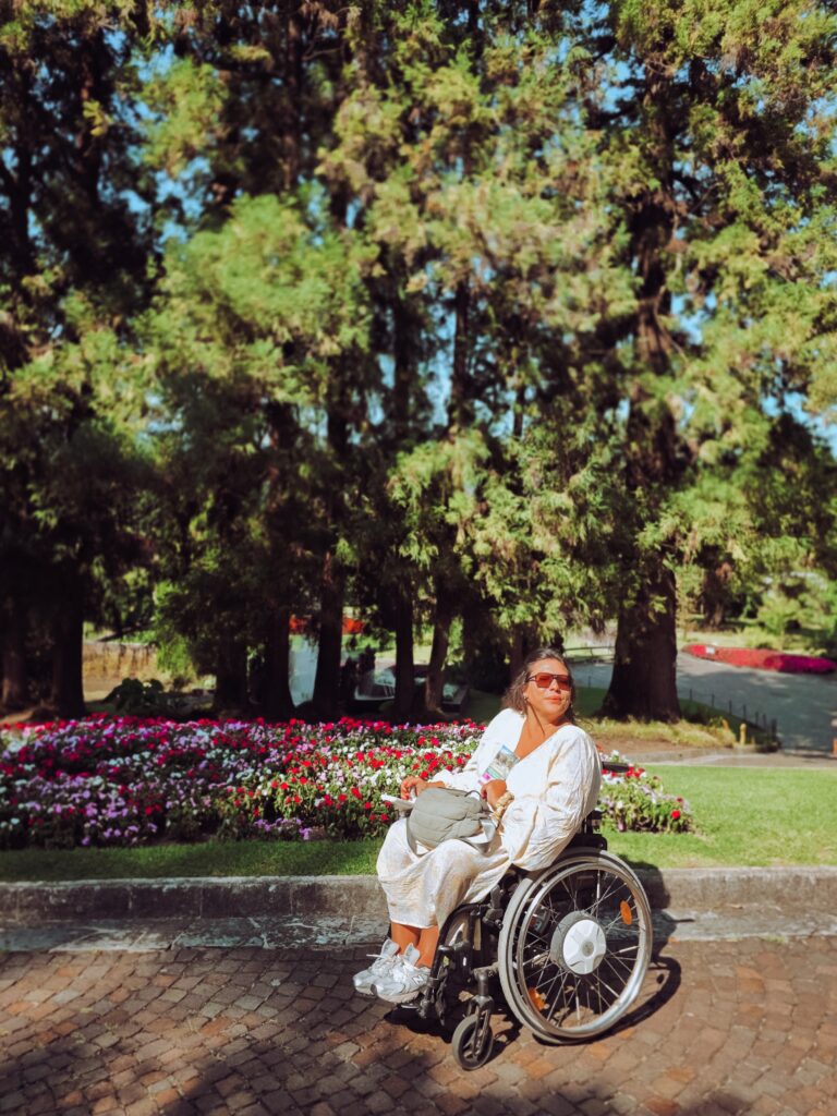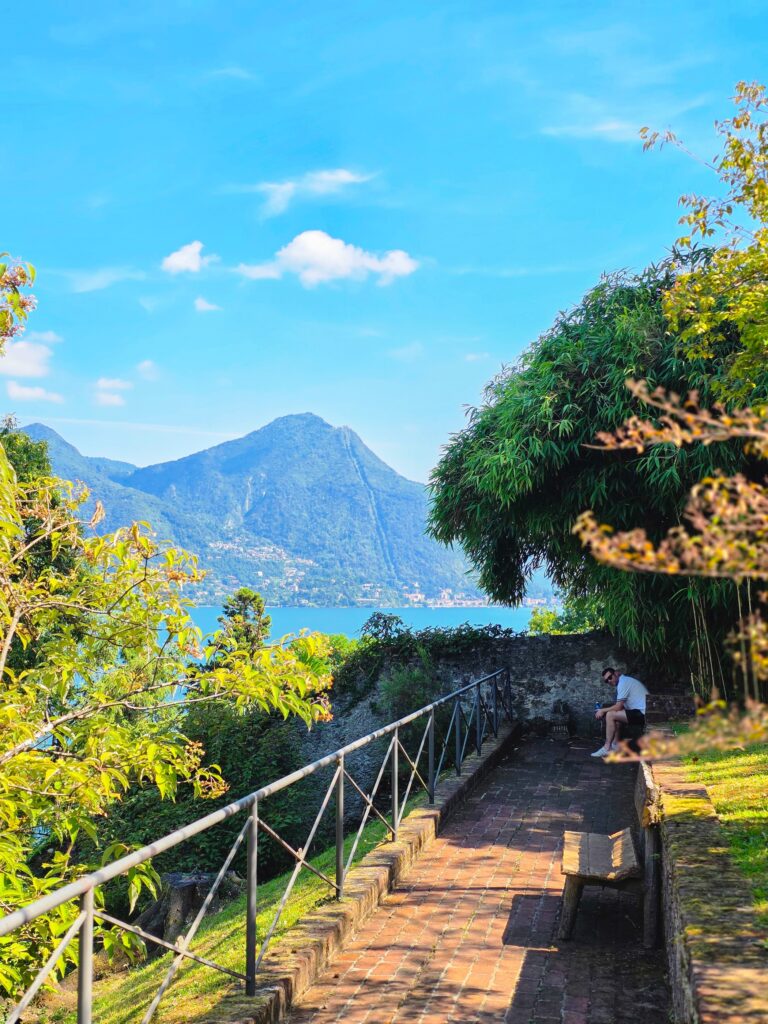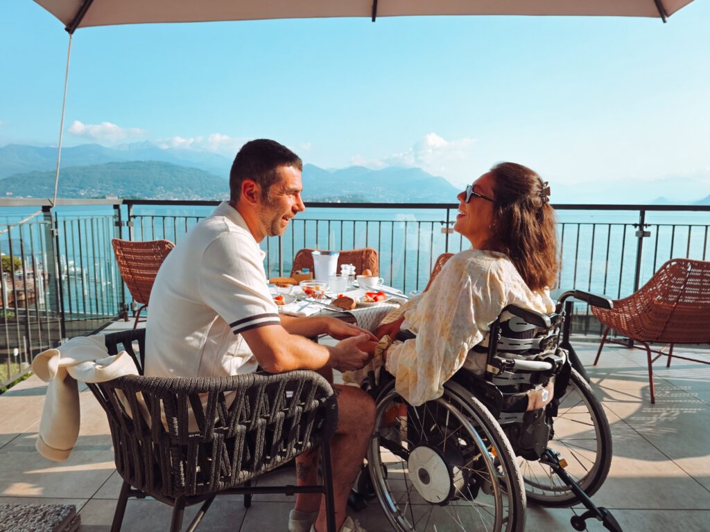 Es gibt eine ca. 4 km Route für Rollstuhlfahrer, zwar ohne Treppen, aber teilweise mit erheblicher Steigung, weshalb wir wieder mal richtig froh über meinen e-fix Antrieb waren, ohne den wir die serpentinenartigen Spazierwege nicht (ganz so easy) hochgekommen wären. Also ggf. an eine starke Begleitung denken und euch mental schon darauf einstellen. Der Blick von oben über den Lago Maggiore wird euch entsprechend entlohnen. Es gibt ein kleines Café, das zu einer gemütlichen Pause einlädt. Der Eintritt für Personen mit Rollstuhl und deren Begleitperson ist übrigens frei (ansonsten zwischen 7 und 13 € hier online).