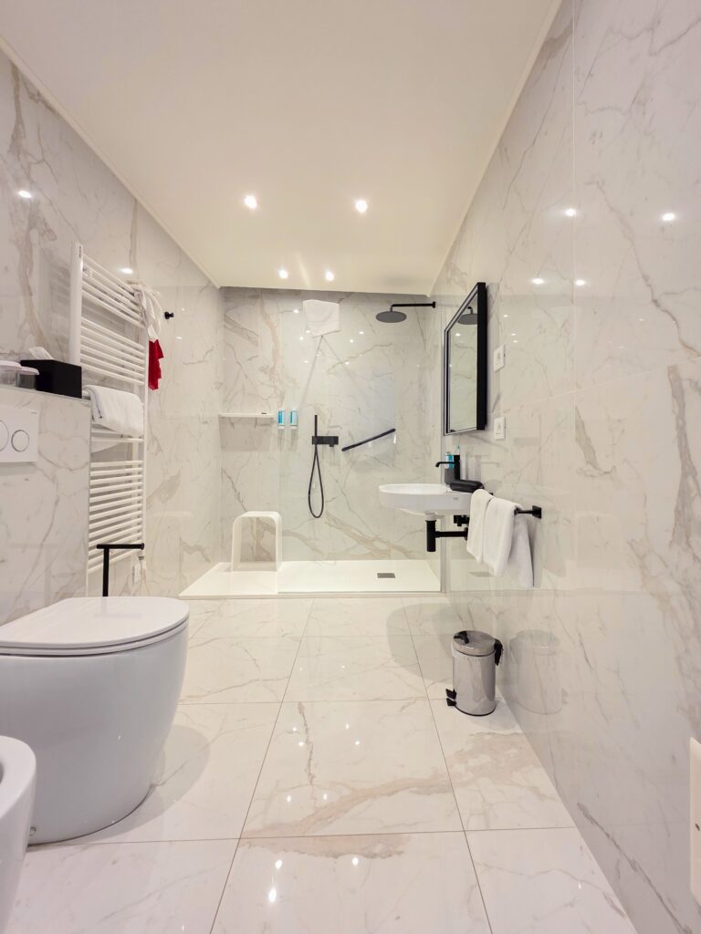 Die Zimmer sind geräumig und modern eingerichtet, die Türen breit genug für Rollstühle und das Badezimmer ist mit einer ebenerdigen Dusche und ausreichend Bewegungsfläche ausgestattet. Es gibt jedoch keine explizit rollstuhlgerechte Ausstattung in Form von Haltegriffen oder Ähnlichem in den Zimmern, abgesehen von der rollstuhlgerechten Toilette im Erdgeschoss, die wiederum mit Griffen ausgestattet ist. Der Zugang zum Hotel ist problemlos möglich, eine sanfte Rampe führt zum Eingang und im Gebäude befördert ein Aufzug euch auf alle Etagen. Die Lage direkt am Lago Maggiore ist perfekt für Spaziergänge am Seeufer, kurze Wege zu Restaurants und Cafés sowie für Ausflüge in die charmante Altstadt. Wer Komfort, moderne Ausstattung, eine herzliche Gastfreundschaft und eine zentrale Lage begrüßt, ist hier genau richtig.